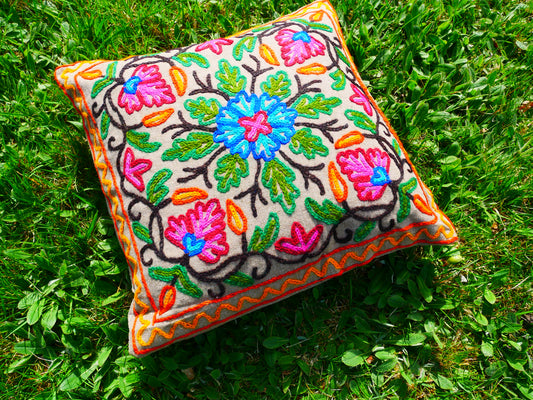 Colorful Kashmiri Crewel Pillow Cover: Handcrafted by Artisans 16x16 inches Handembroidered wool on cotton