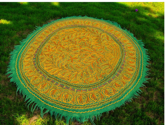 Kaschmir Wollteppich - grüner Rundteppich "Namda" handgefilzter und bestickter Bodenteppich aus Indien | 5 ft Boho-Teppich -
