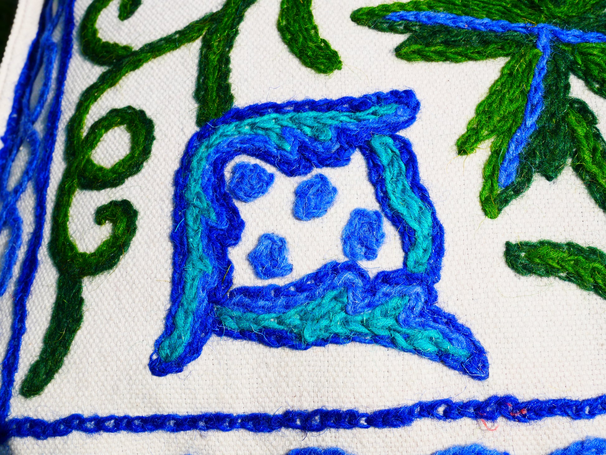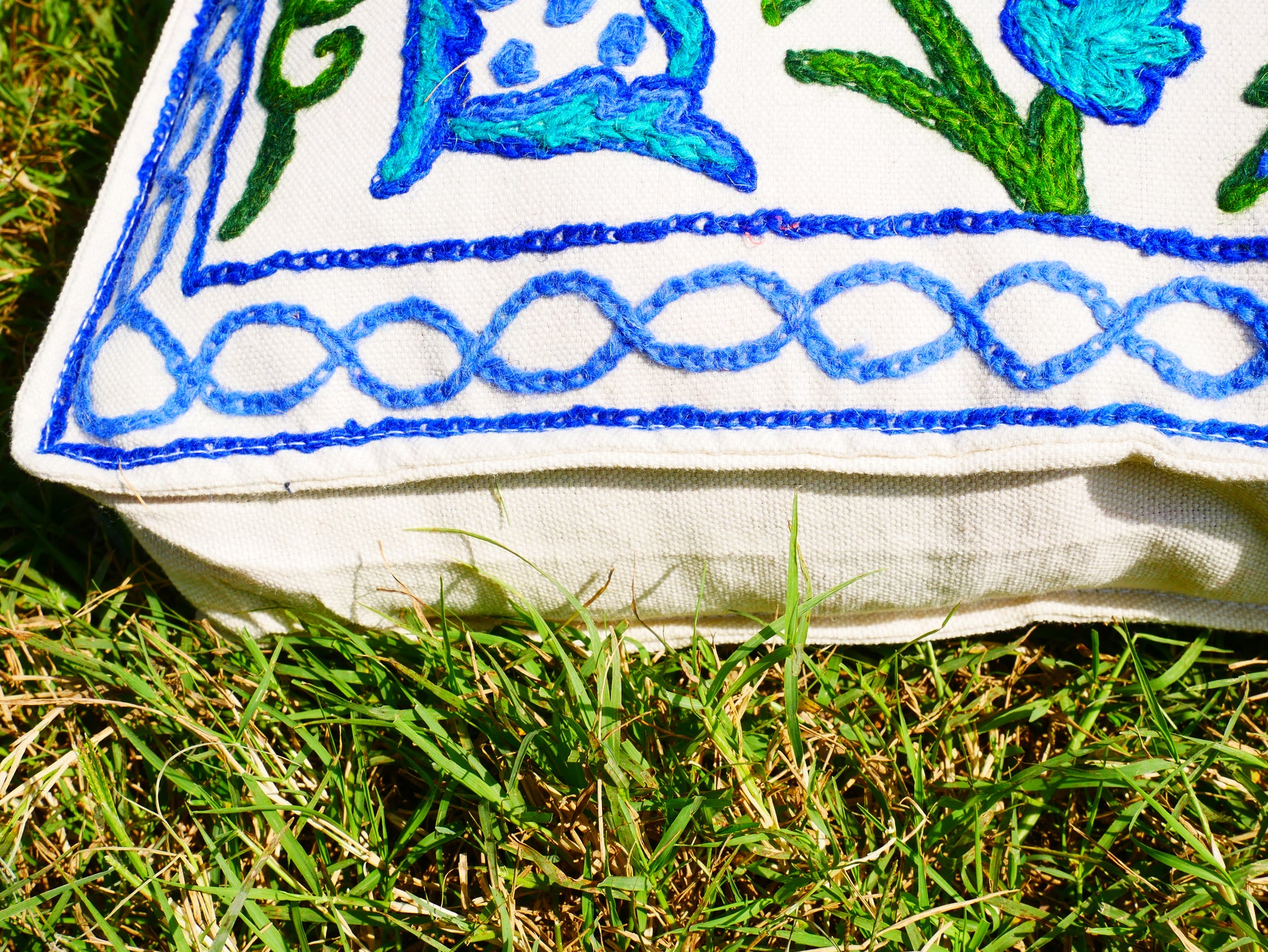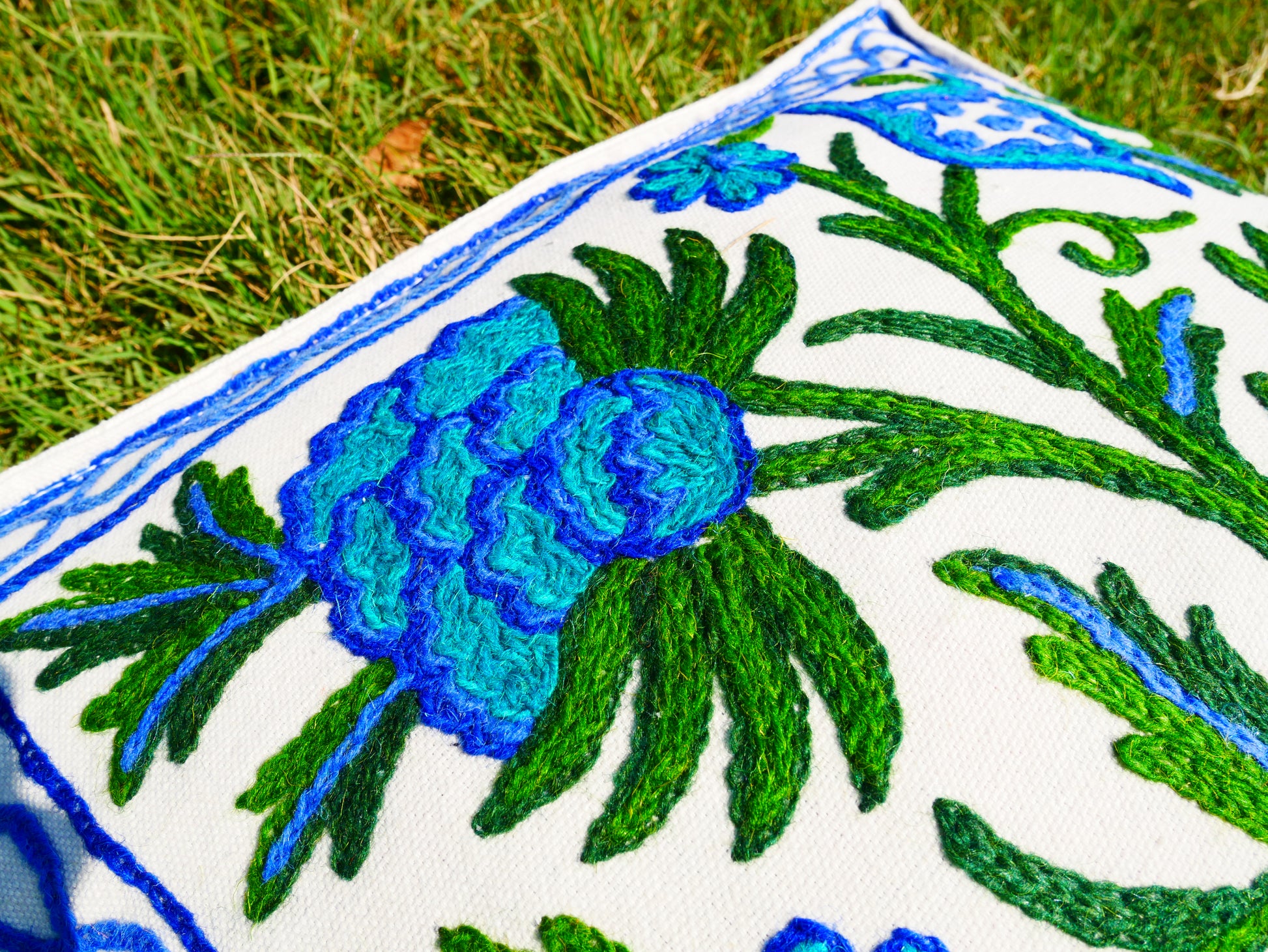 Die Arbeit gliedert sich in Bedrucken (Handblockstempel), Färben des Wollfadens mit natürlichen (Pflanzen-)Farben, Zuschneiden und Konfektionieren, Handarbeiten (Aari) durch die Handwerker und spezielles Wasch-Finish, damit die Farben lange halten Lebensdauer. Für jedes Kissen stecken also mindestens 5 Personen ihr Handwerk und ihre Liebe in das Endprodukt.