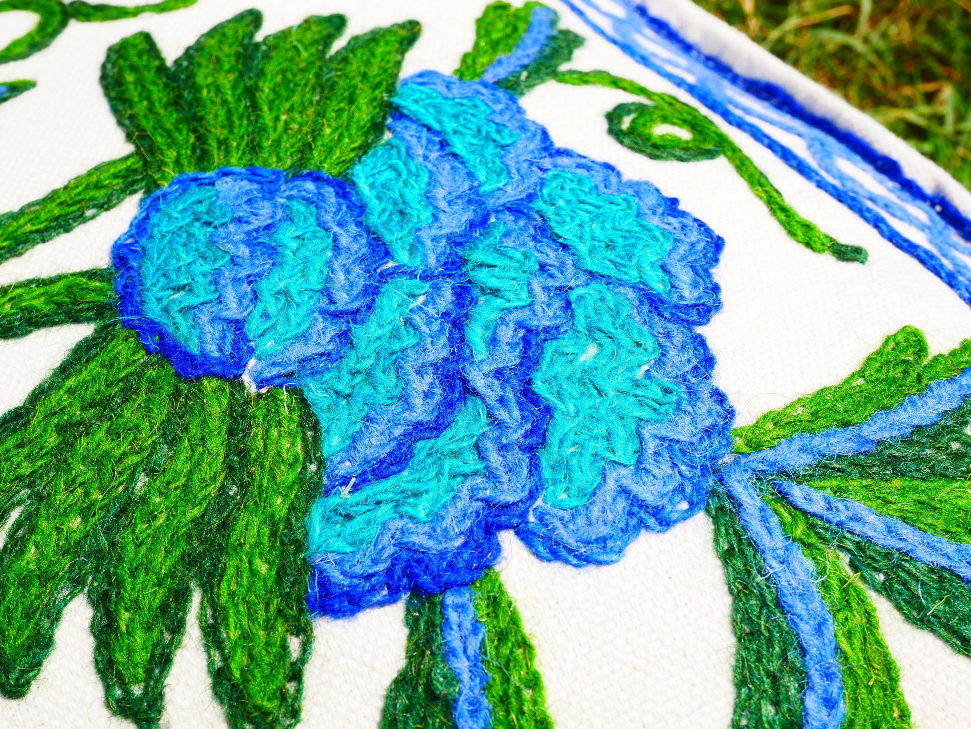 "Crewel-Stickerei oder Crewelwork ist eine Art Oberflächenstickerei mit Wolle. Eine Vielzahl verschiedener Stickstiche wird verwendet, um einem auf den Stoff aufgetragenen Designentwurf zu folgen. Die Technik ist mindestens tausend Jahre alt" Quelle: Wikipedia