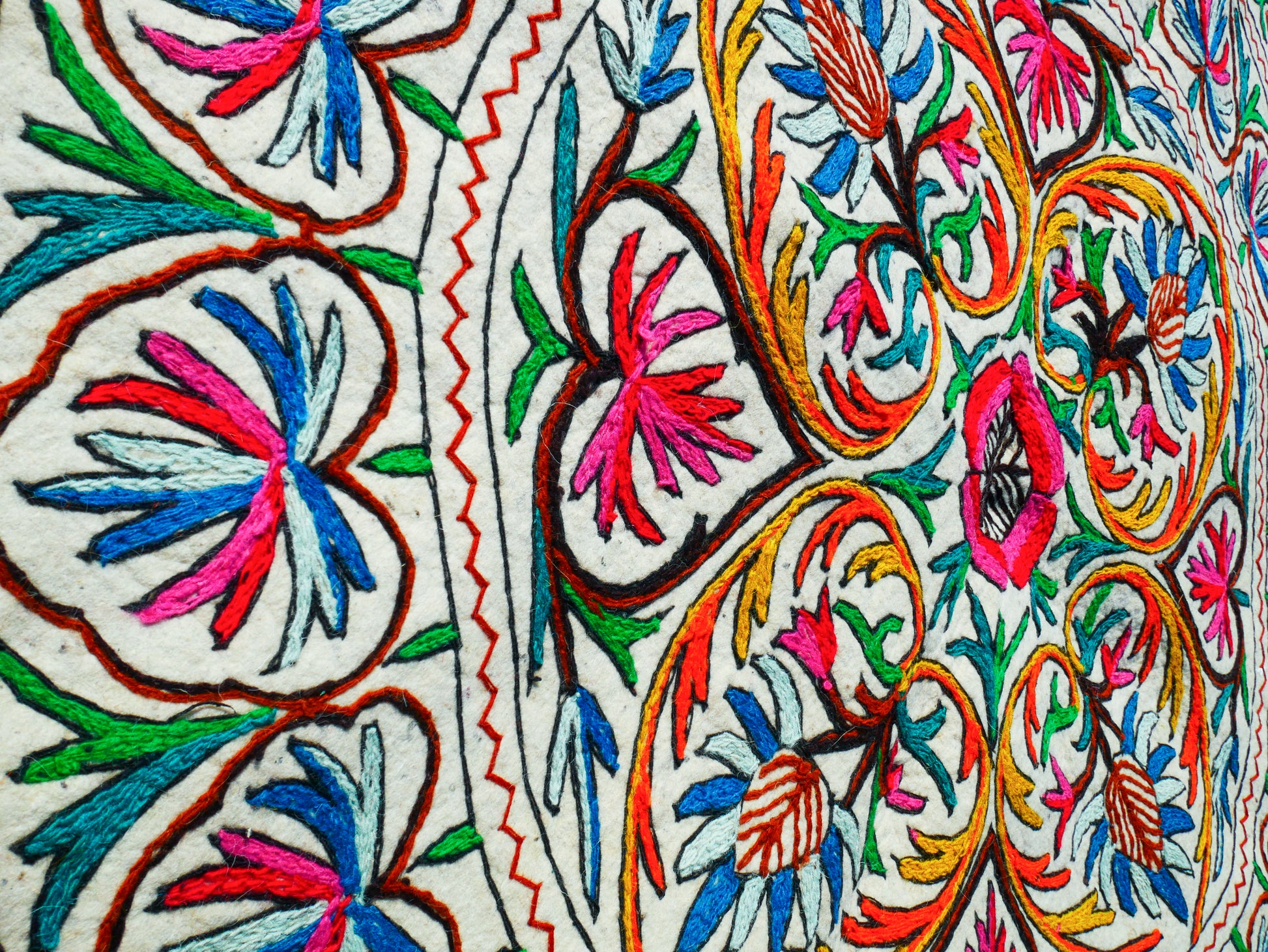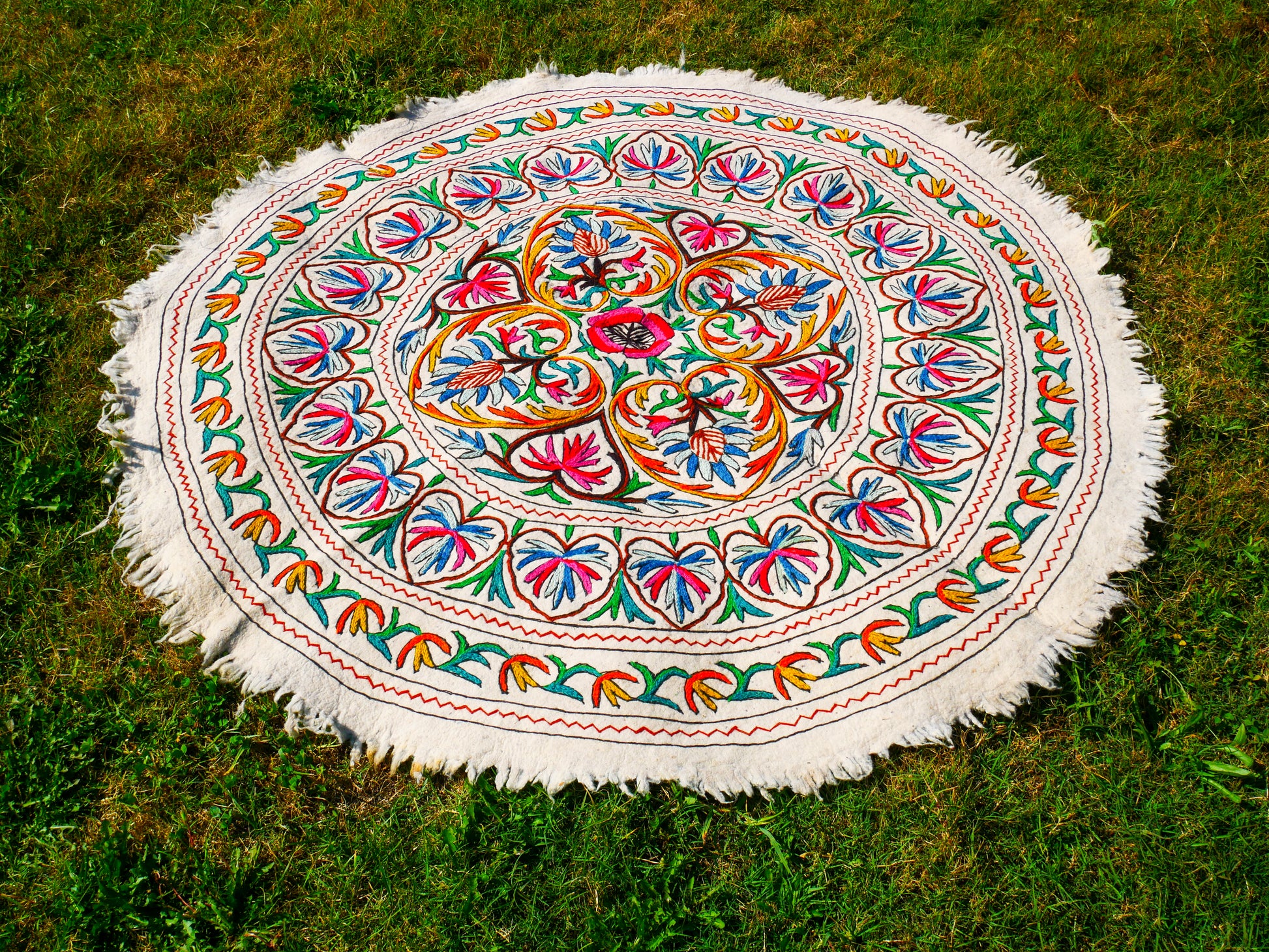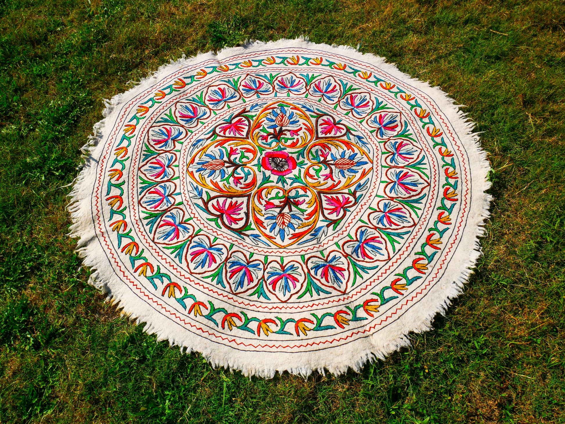 Im mystischen Staat Kaschmir in der nordindischen Himalaya-Region ist es Tradition, egal ob arm oder reich, auf dem Boden zu sitzen, und der Boden kann in der Himalaya-Region Kaschmir sehr kalt werden. Namdas aus reiner Wolle – von Hand gefilzt und bestickt – sind nicht nur dekorative Teppiche und zauberhafte, einzigartige Textilkunstwerke, sondern auch die beste Antwort auf kalte Böden und perfekt für schöne Sitzgelegenheiten auf dem Boden. Sie werden auch als dekorative Bettdecken verwendet oder um jede Ecke des Hauses mit ihrer schönen Stickerei als böhmischen Wandteppich zu schmücken. Wie wäre es, sie für Ihre gemütliche Boho-Schlafzimmerecke zu verwenden? Sie werden das „natürliche Gefühl“ lieben!
