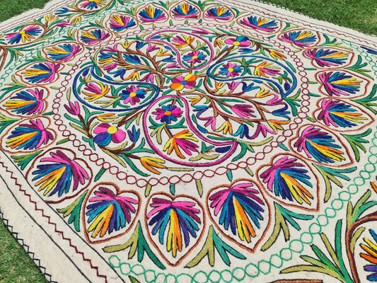Hand embroidered Kashmiri bedspread - colorful crewel embroidery - large boho bed throw