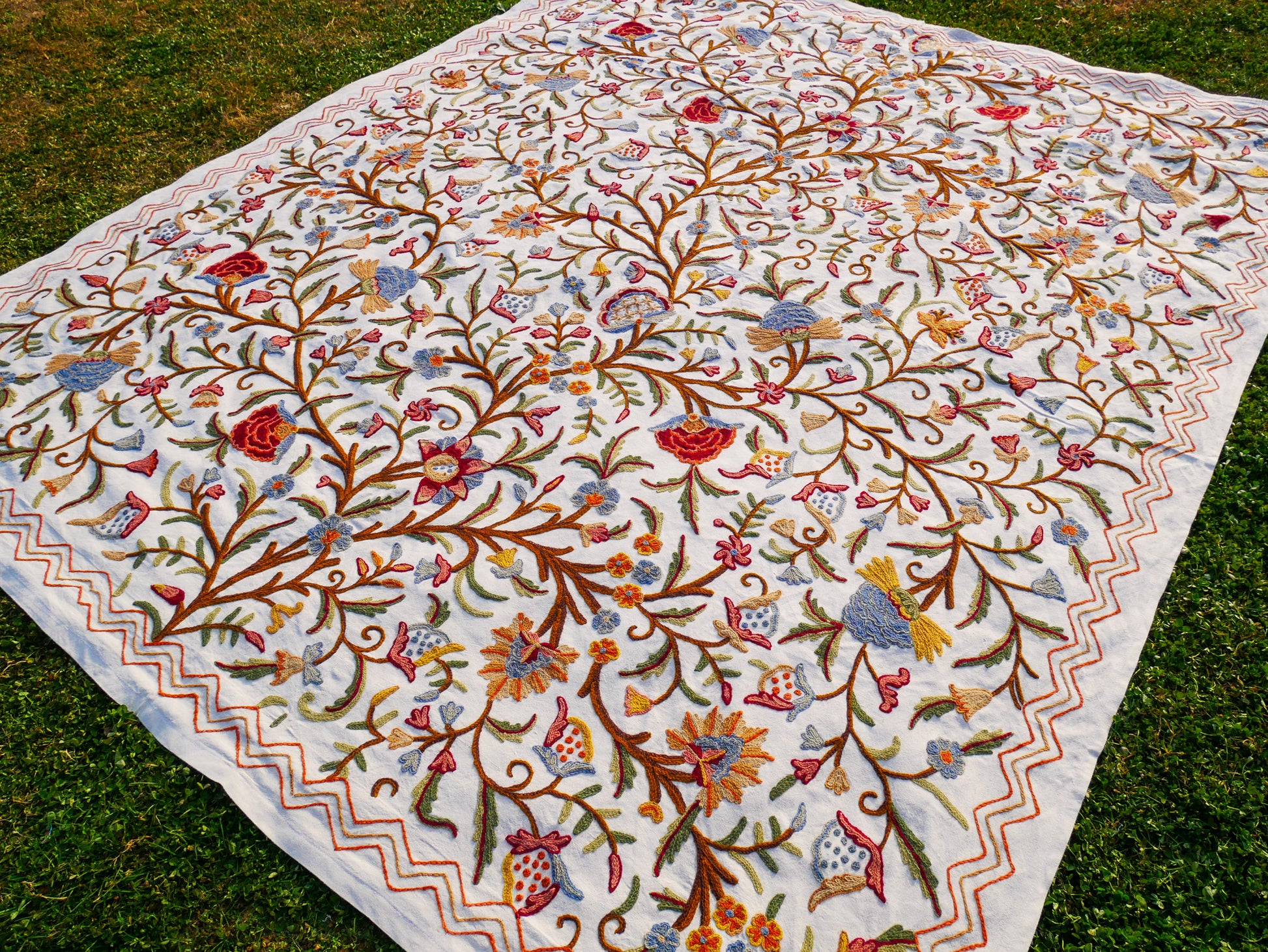 Crafted in the heart of mystic Kashmir, this piece carries the centuries-old legacy of traditional Mughal Crewel embroidery — an art form that has enchanted royalty and travelers for generations.