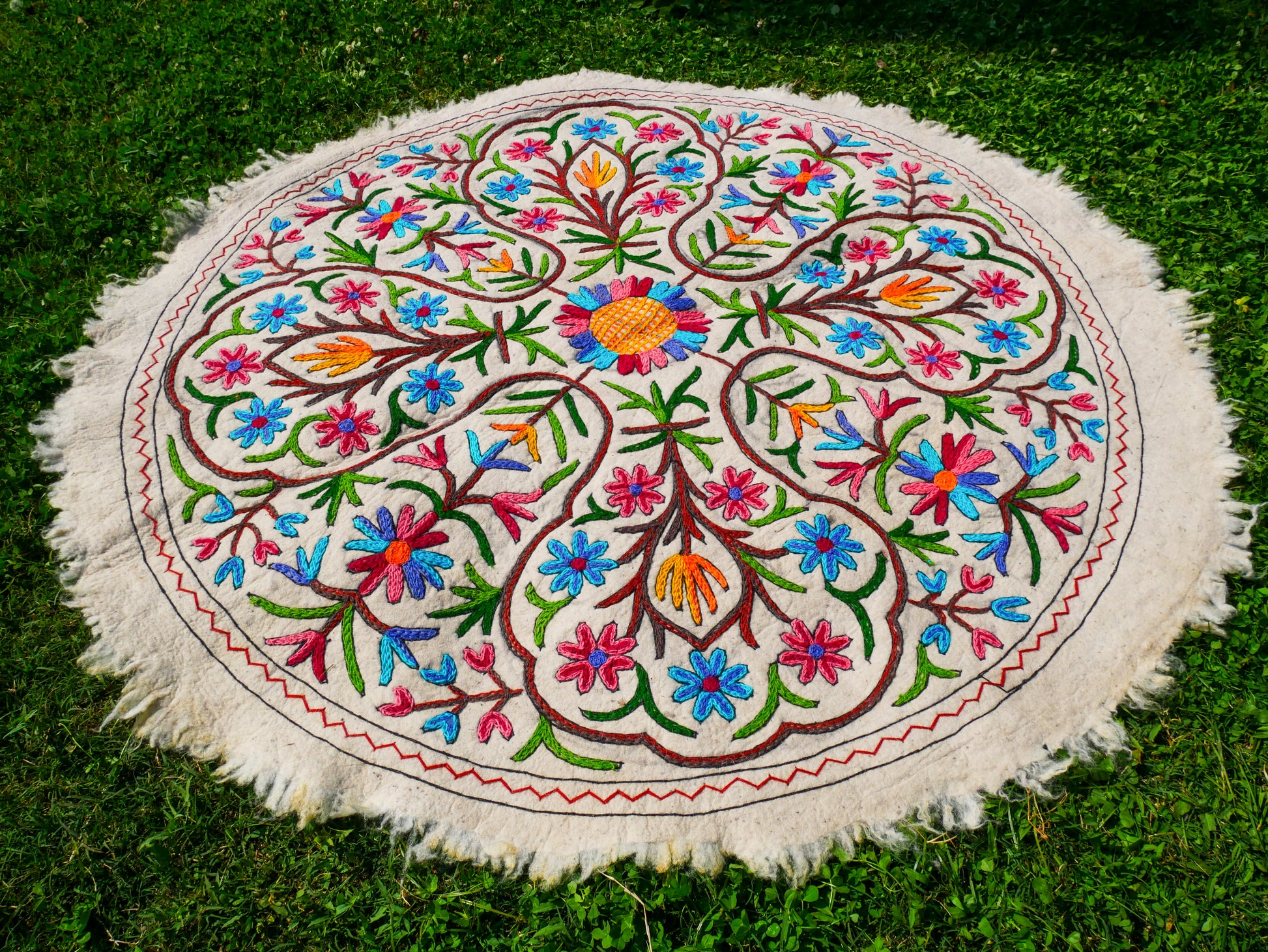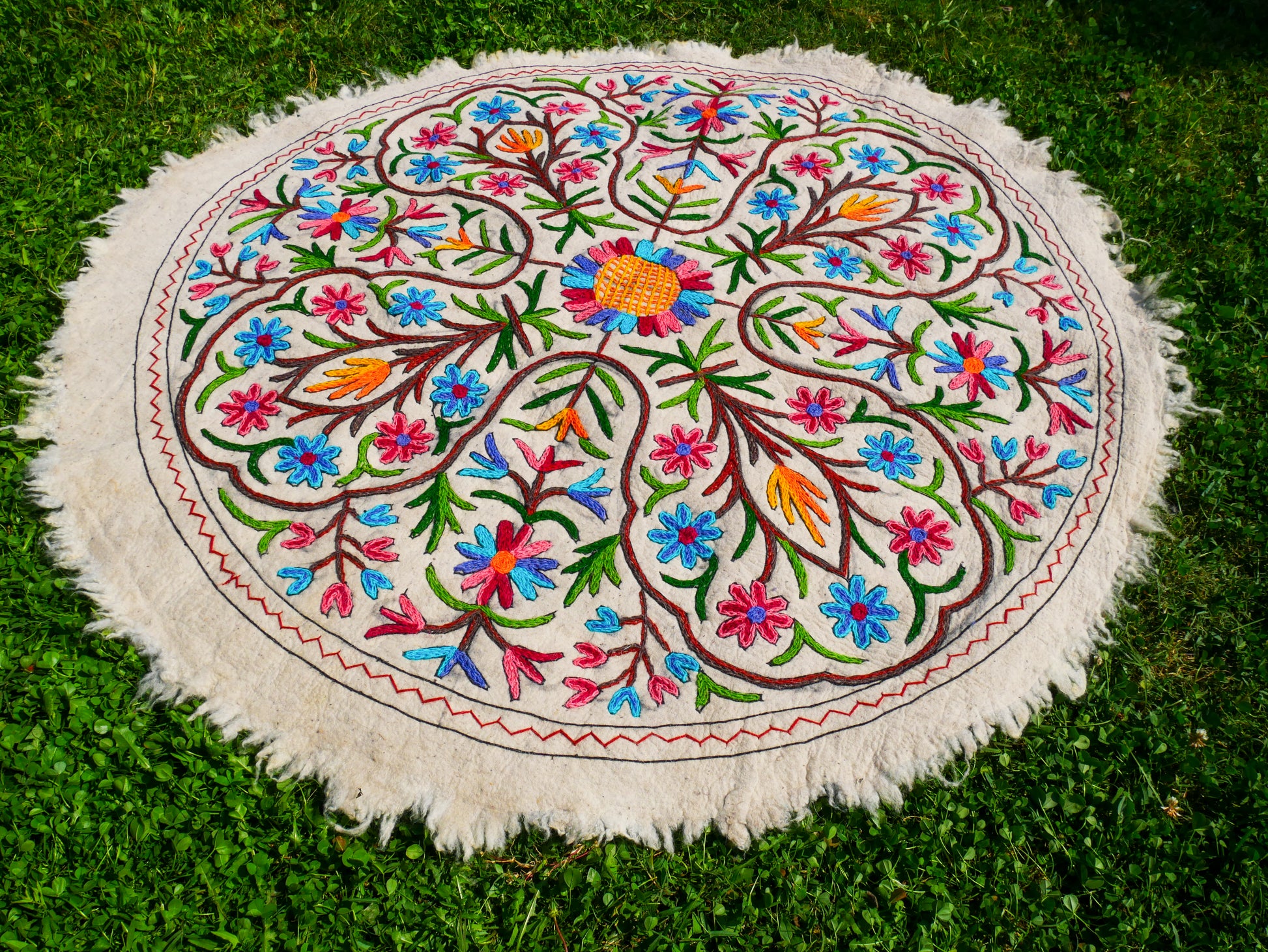 Round rug 5 ft boho wool rug "Namda" from Kashmir hand felted and embroidered
