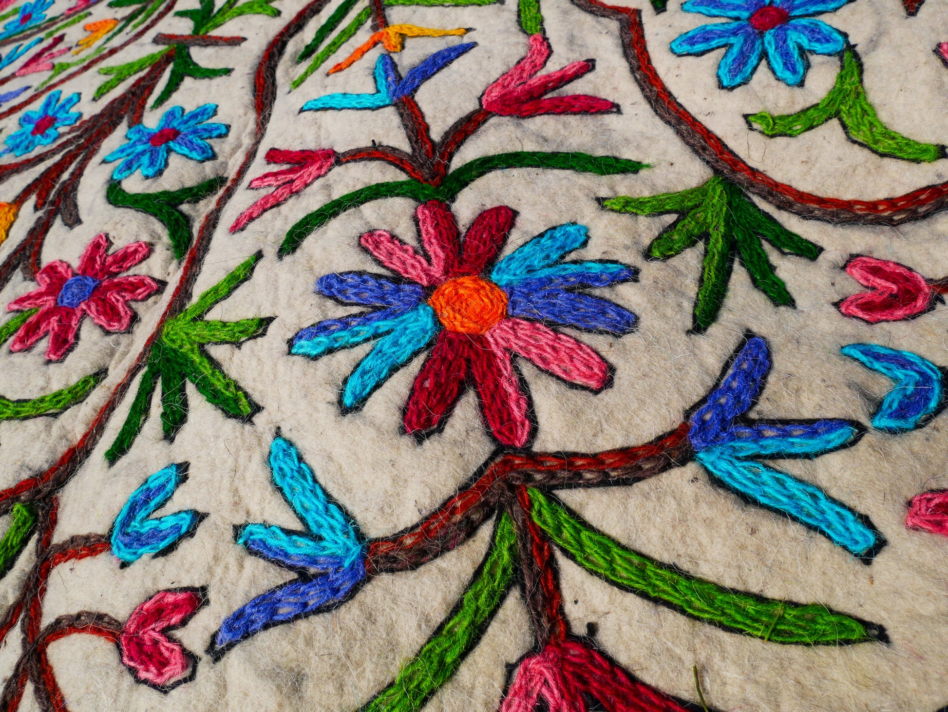 In the mystique state of Kashmir in the North Indian Himalayan region, no matter poor or rich, it is traditional to sit on the floor and the floor can get really cold in the Himalayan region of Kashmir. Namdas, made of pure wool - hand felted and embroidered, are not only decorative rugs and magical, unique pieces of textile art, but also the best answer to cold floors and perfect for beautiful floor seating arrangements. They are also used as decorative bed covers or to adorn any corner of the home with its beautiful embroidery as bohemian tapestry How about using it for your cozy boho bedroom corner? You will love the "natural feeling" of it!