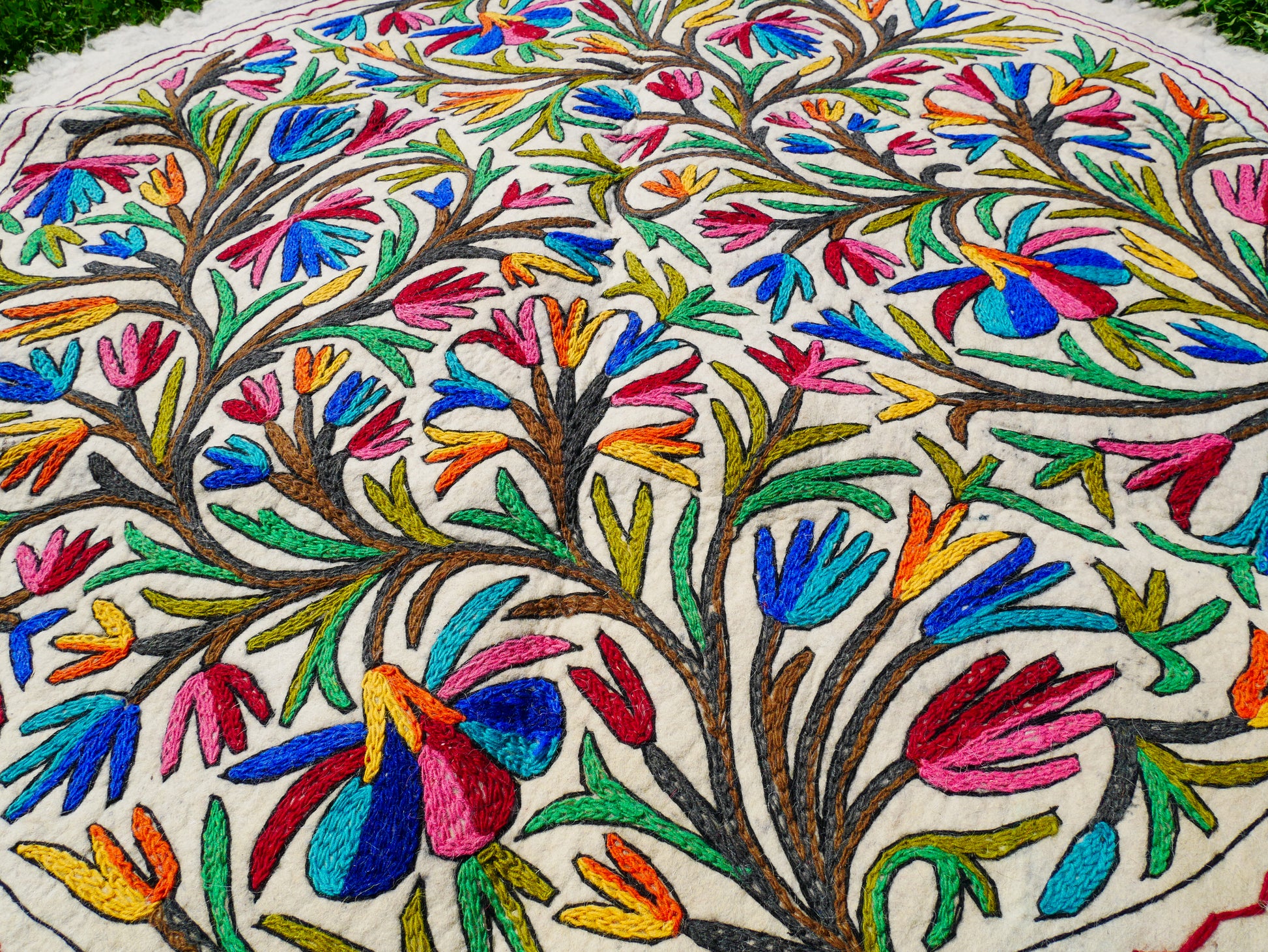 Add warmth and color to your home with this beautifully hand-embroidered Namda rug from Kashmir. Made from thick felted Himalayan wool, it features a lively floral pattern stitched entirely by hand using traditional crewel embroidery. Each rug is unique, a work of textile art that brings both heritage and joy to any space.