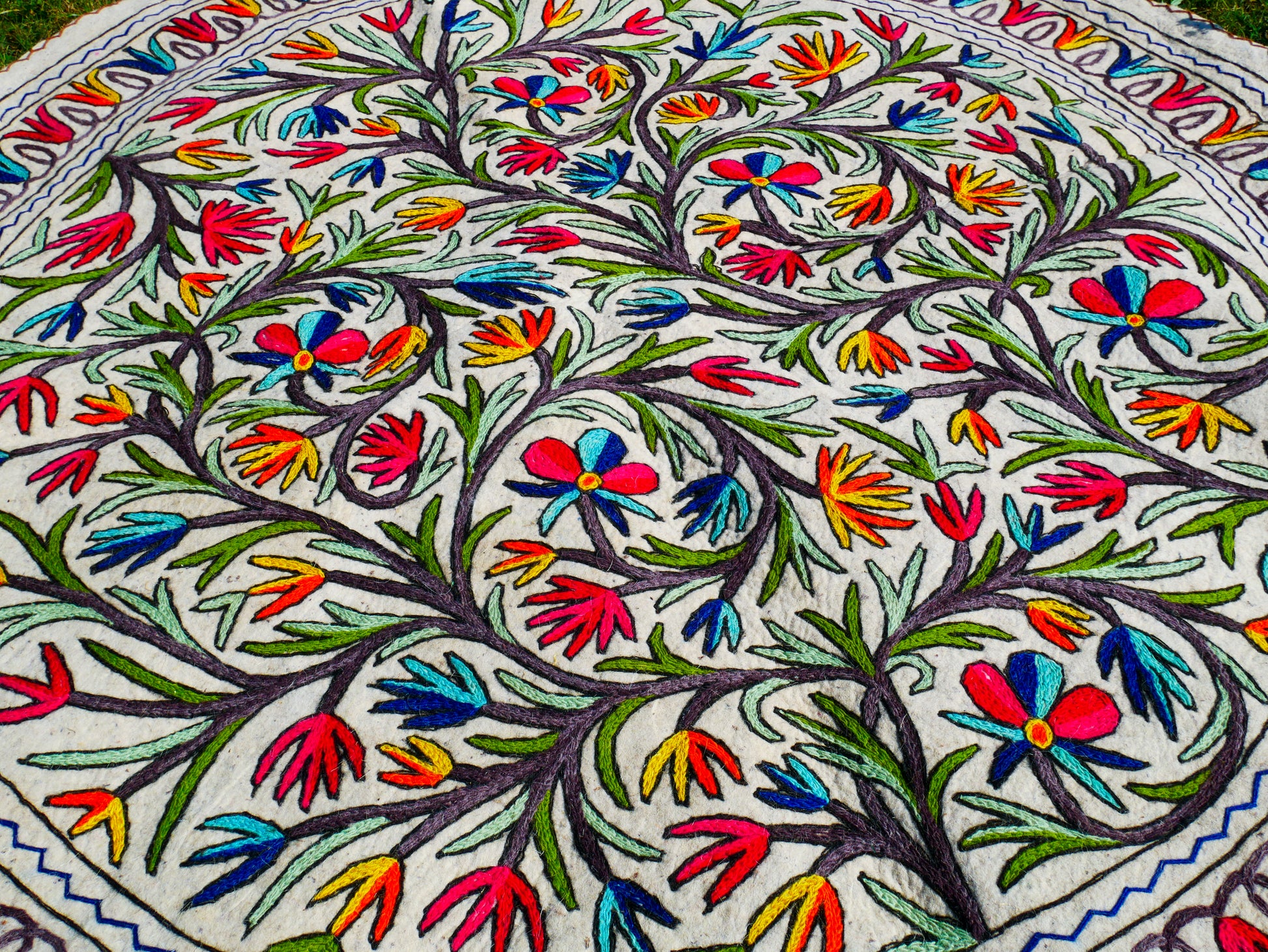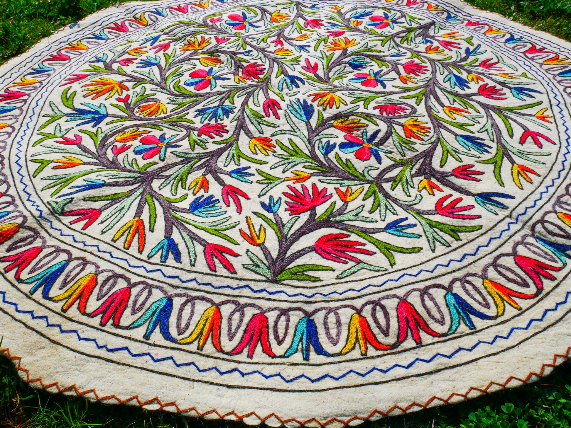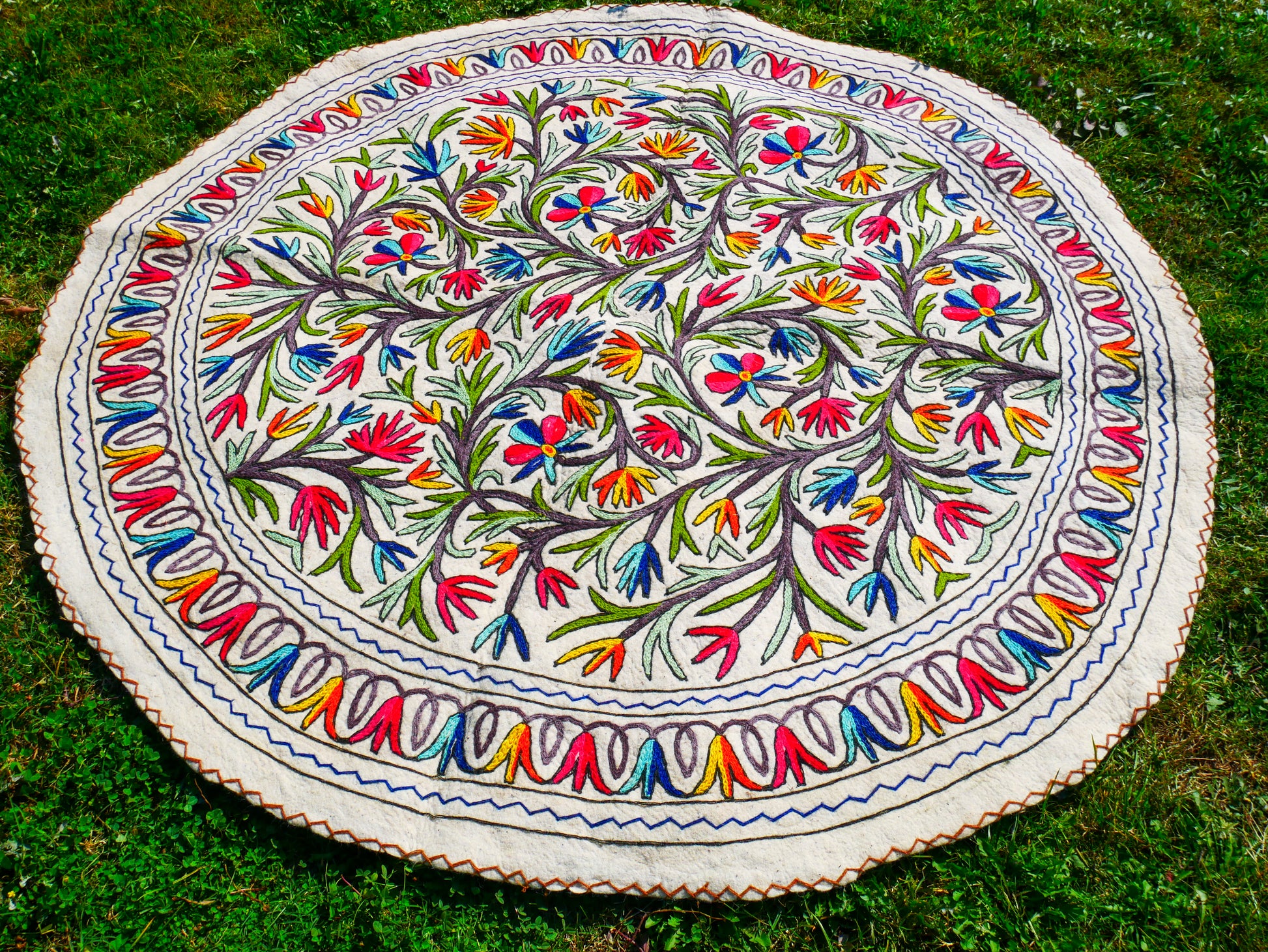 Boho wool rug "Namda" from Kashmir hand felted and embroidered 6ft round