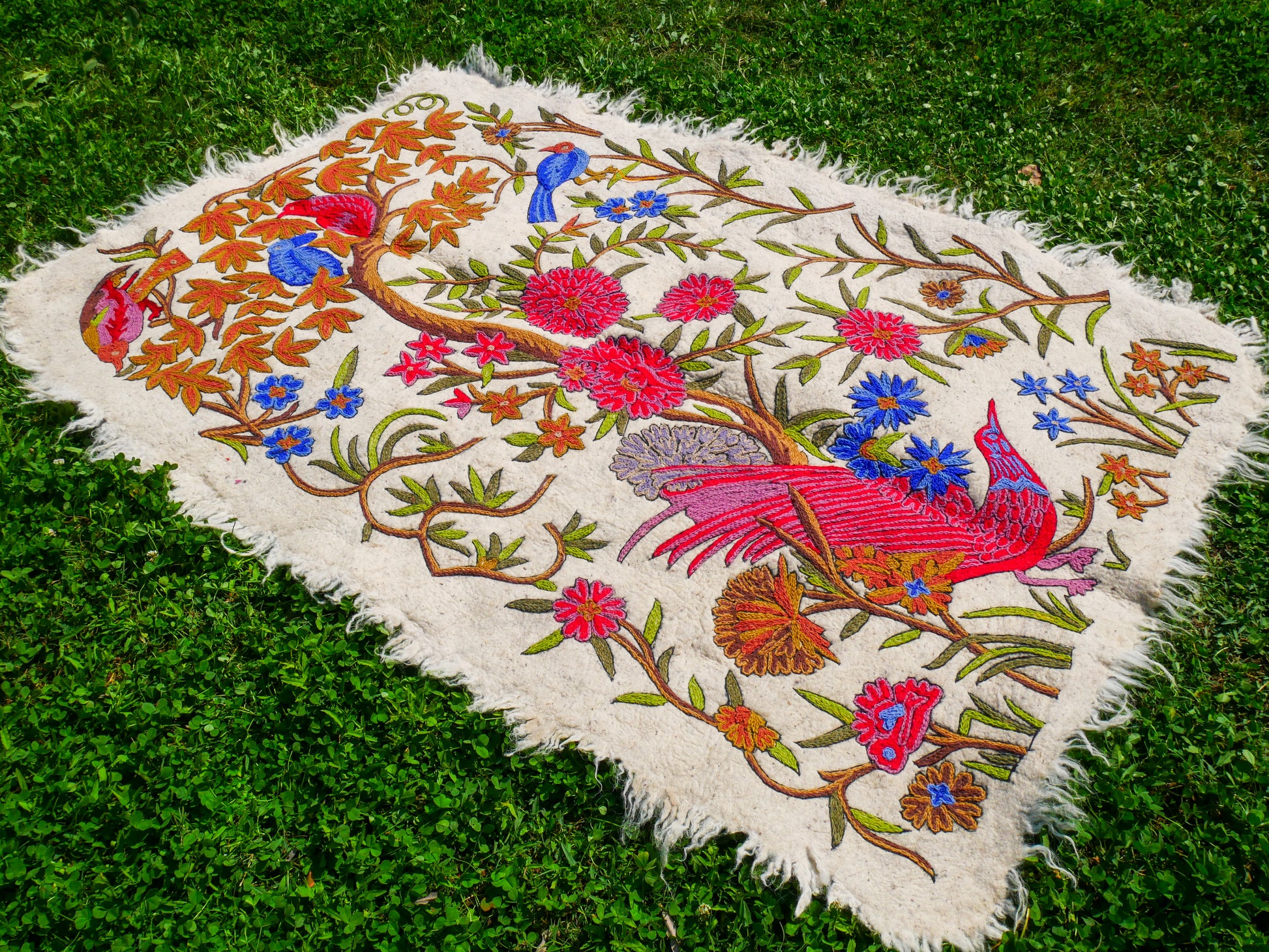 Hand-embroidered in Kashmir, India – made by skilled artisans using centuries-old techniques. Material: 100% felted wool base with fine wool embroidery threads. Design: Colorful birds and flowers on a soft natural background. Size: Approx. 6 × 4 ft (180 × 120 cm). Texture: Firm yet soft underfoot; suitable for floors or as a decorative wall hanging.