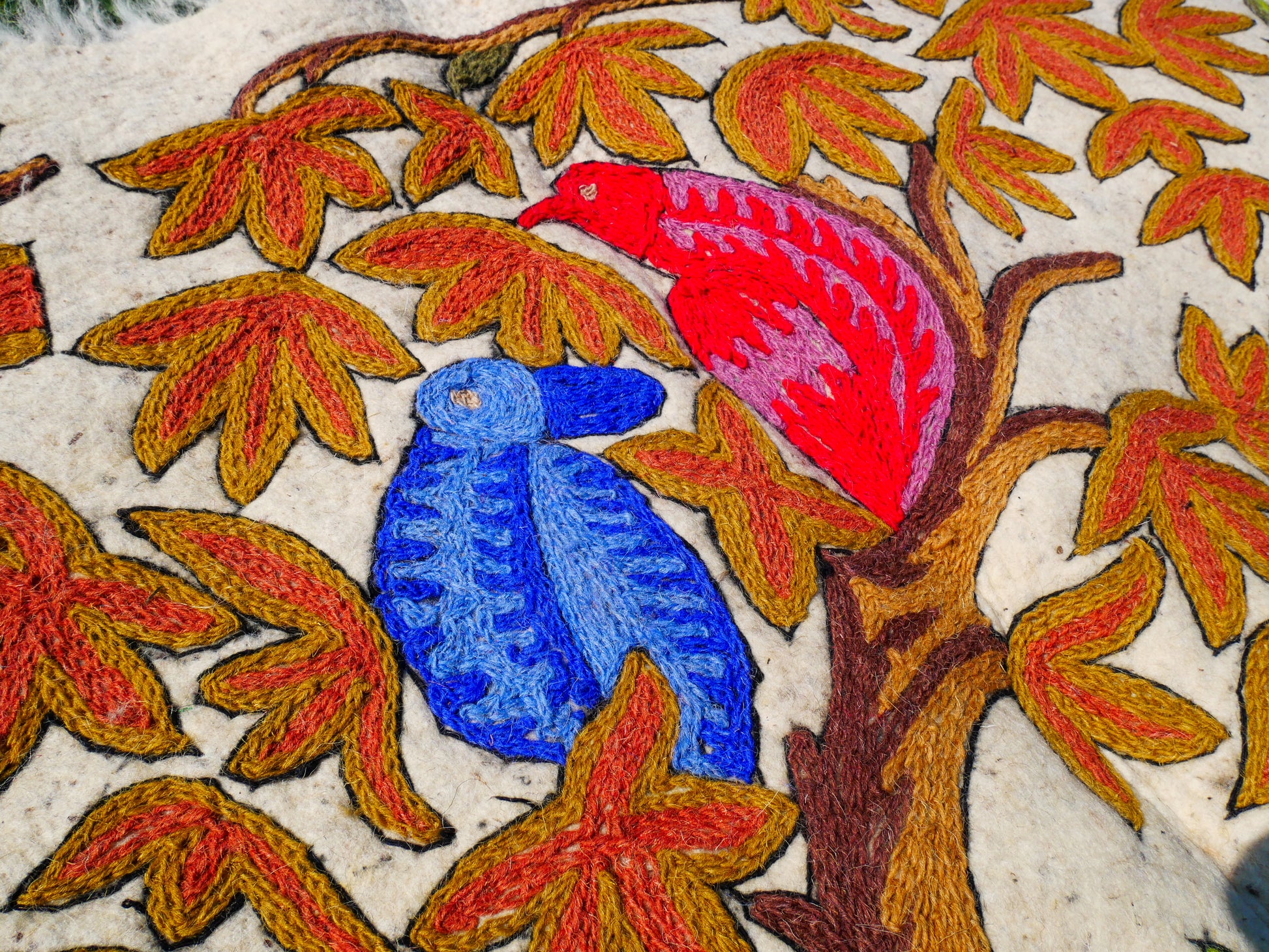 Bring a piece of Kashmir’s heritage into your home. This hand-embroidered Namda rug is crafted from thick felted wool and decorated with vibrant floral and bird motifs, a symbol of joy and abundance in traditional Kashmiri art. Each stitch is done by hand, making every rug a one-of-a-kind textile painting rather than a mass-produced carpet.