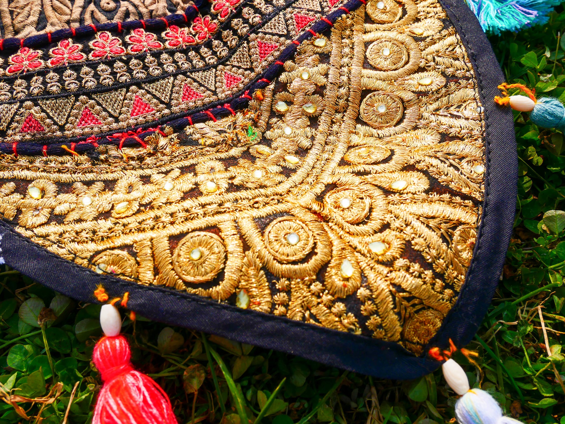 It is made of vintage sari (mostly cotton) patchwork textiles, hand sewn and embroidered with little tiny mirrors embedded.