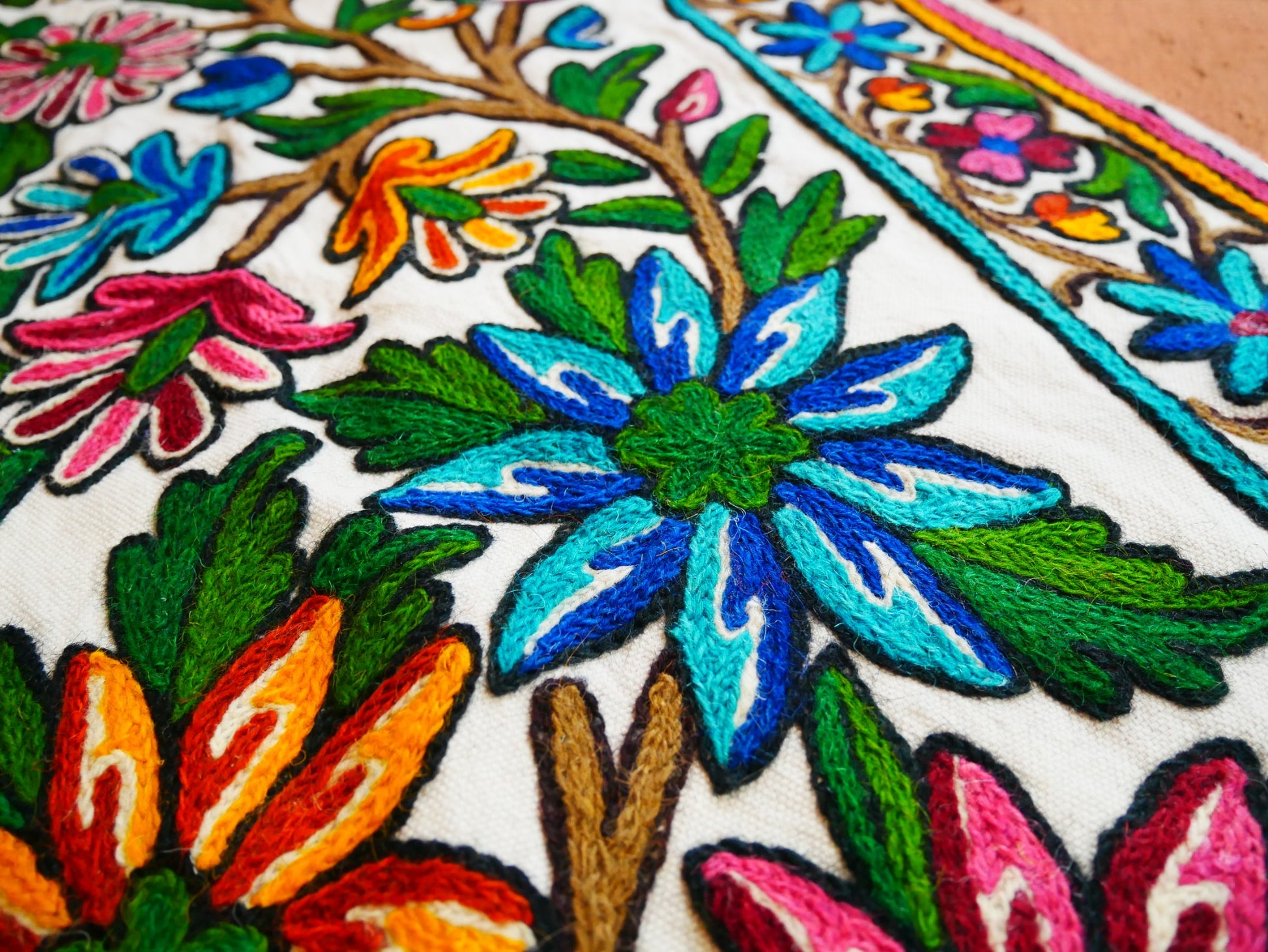 Crewel embroidery from Kashmir is known for its detailed wool thread work on cotton fabric, creating rich texture and timeless patterns. Every table runner is one-of-a-kind, reflecting the heritage and craftsmanship of this historic art form.