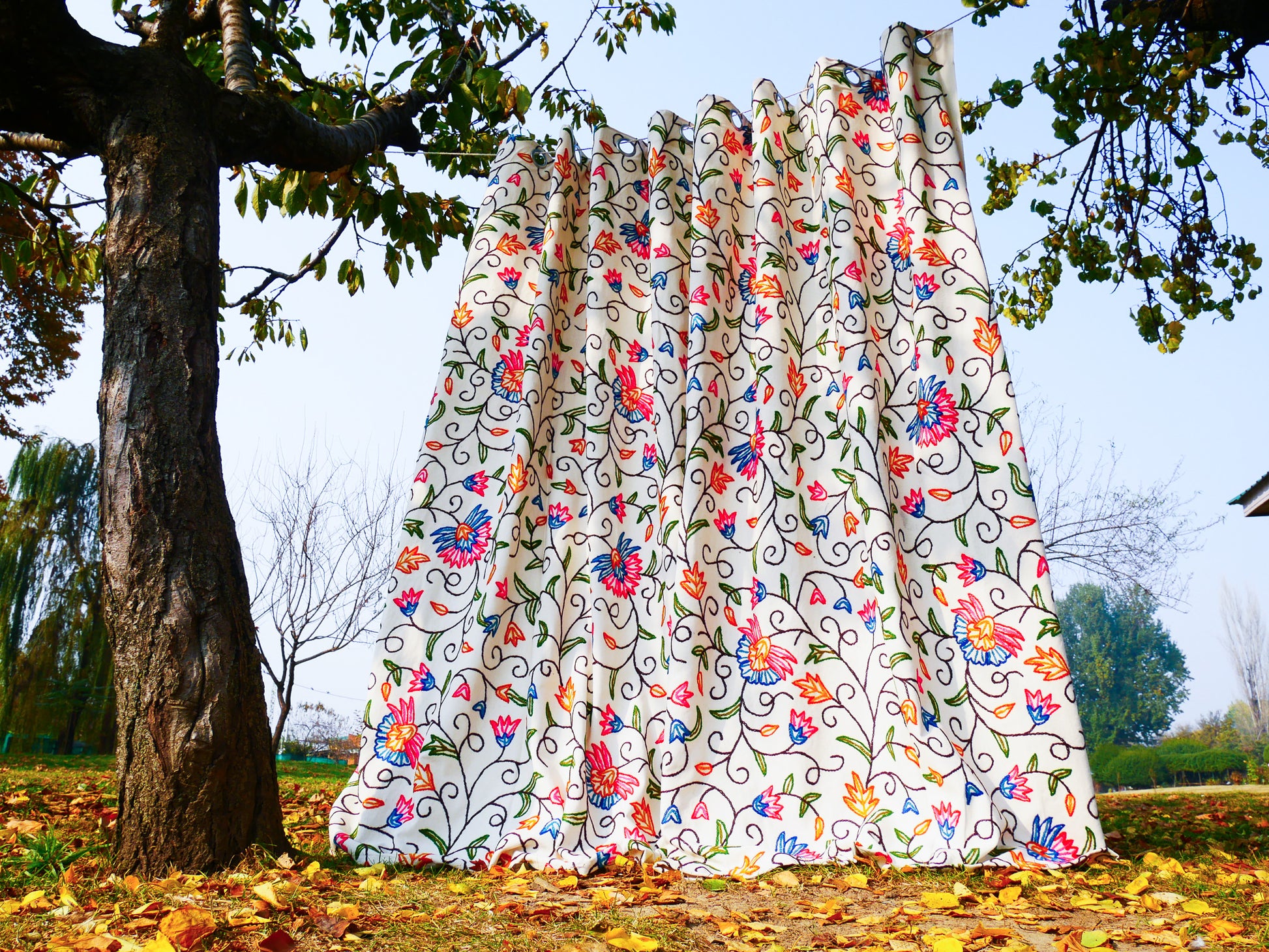 This exquisite curtain fabric is a result of traditional techniques. The cotton is hand dyed as well as the woolen threats with natural vegetable colors, followed by special washing and finishing to ensure long-lasting color vibrancy. After the floral design is hand stamped on the fabric, it is then completely embroidered by hand.