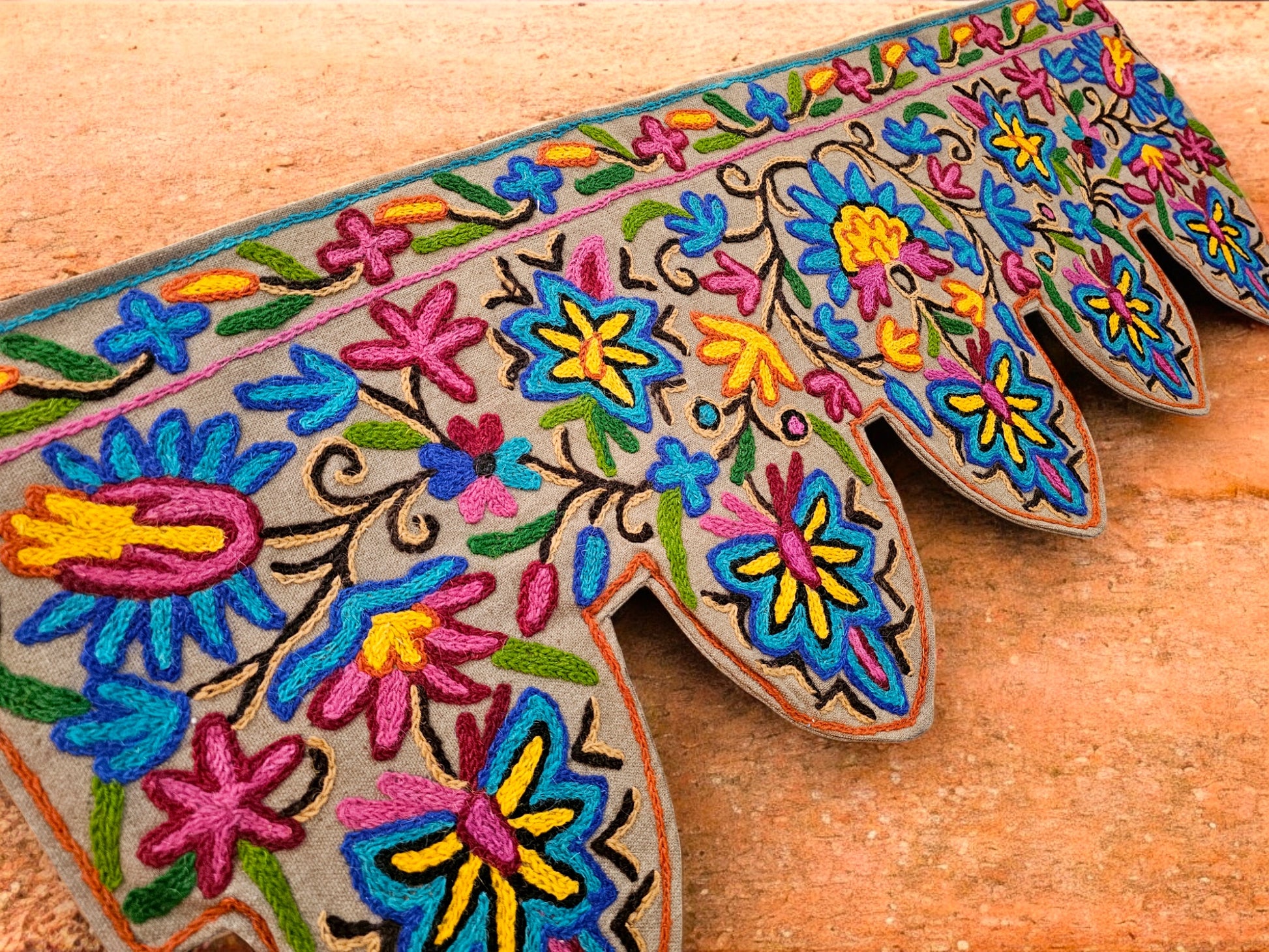 Kashmiri Toran Door Valance 39" Hand-Embroidered Floral Cotton & Wool Banner Crewel embroidery, Boho Wall/Window Decor