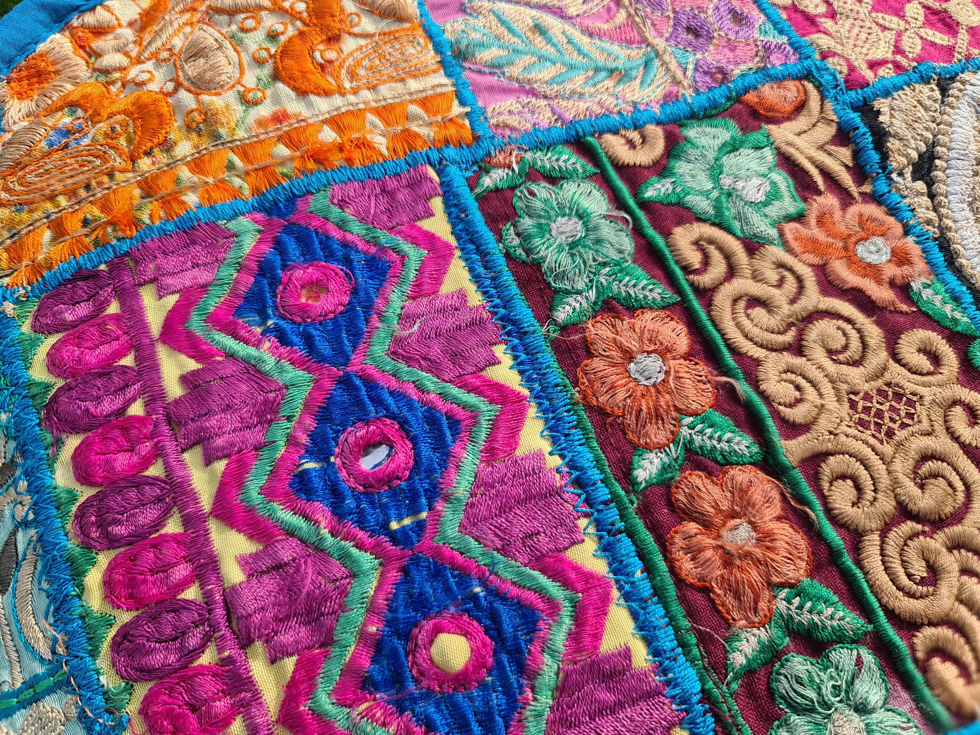Made with vintage Indian fabric, patchwork design, embroidered by hand, with many lovely details.