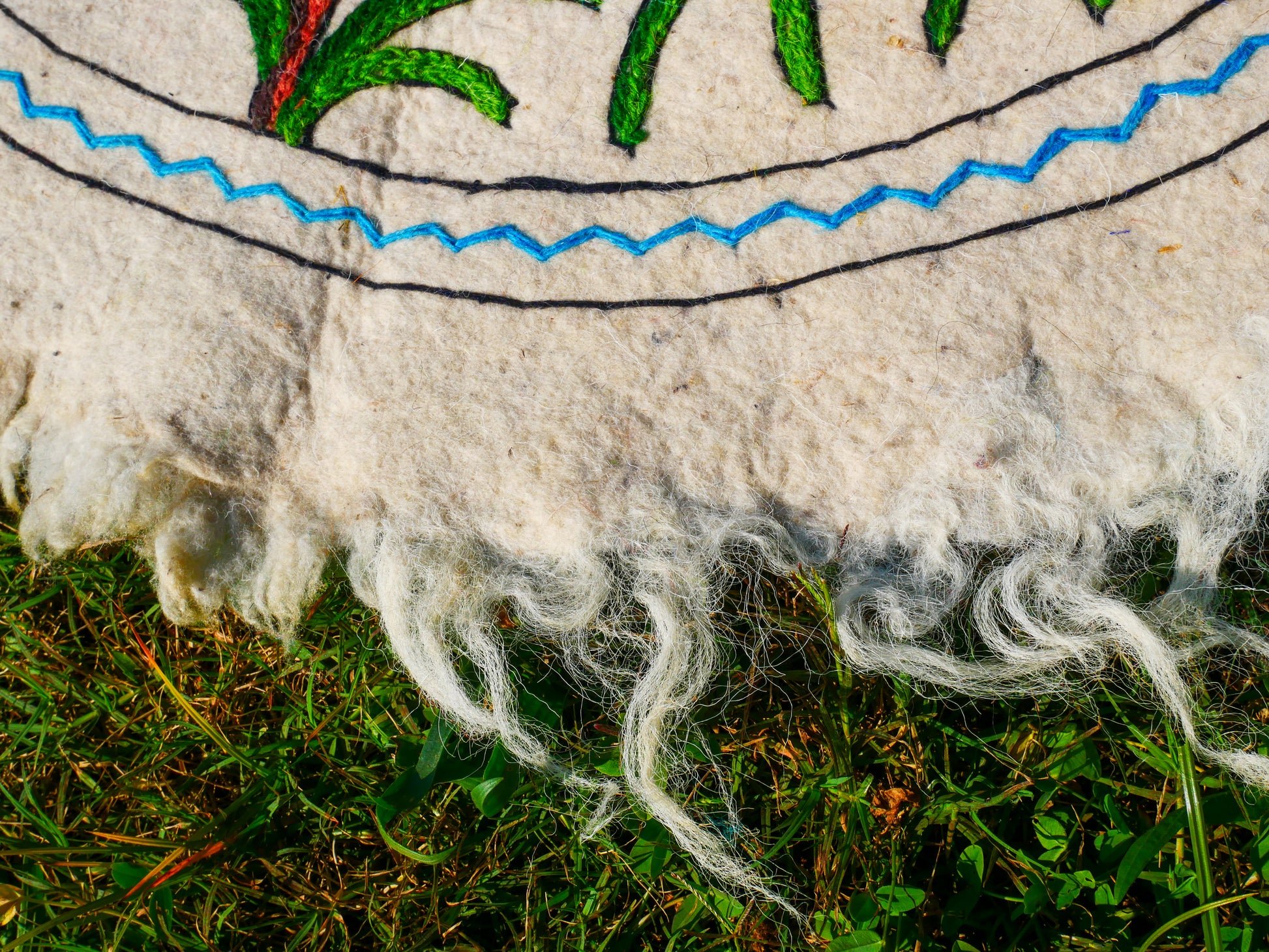 Material: pure sheep wool embroidered with veg. dyed woolen threats